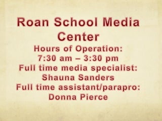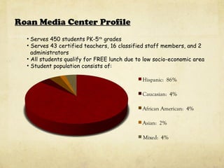 Roan Elementary School's media center serves 450 students and staff in a high-poverty area. The media specialist outlined issues with the current facility and collection, including disorganized magazines, limited seating, and outdated books. Surveys from teachers and students provided recommendations. Proposed solutions included purchasing a magazine rack, beanbag chairs, and new titles. The specialist also suggested reorganizing DVDs by subject and training teachers to check out materials independently. The plan aims to improve the media center's organization, resources, and accessibility to better serve the school community.