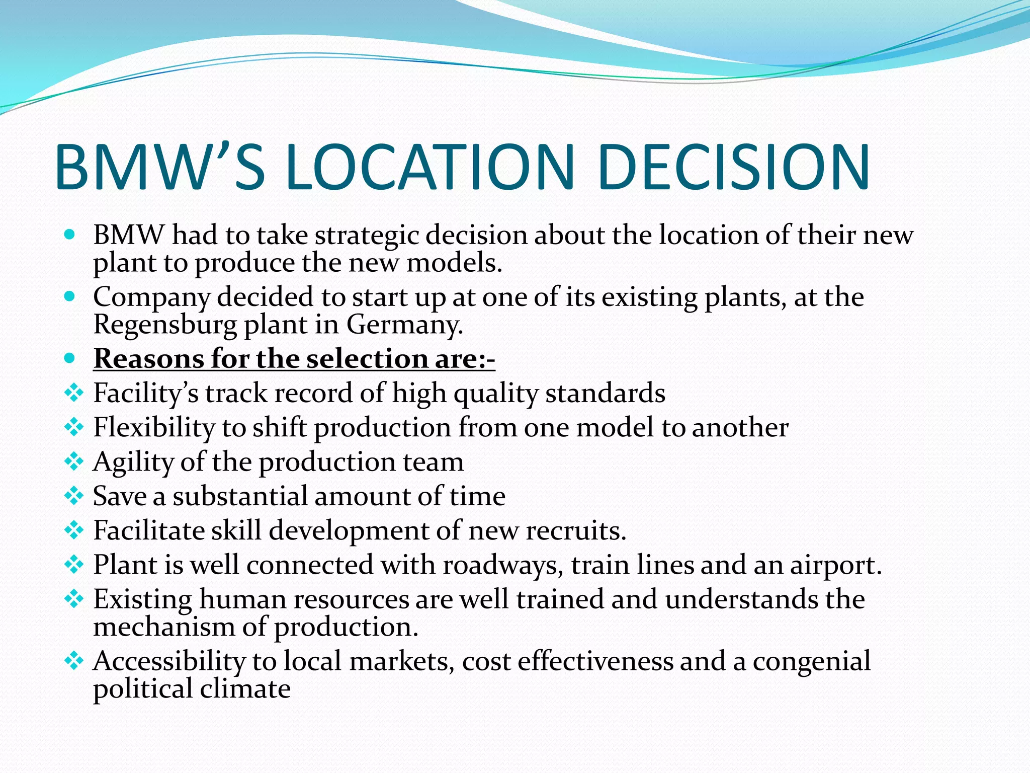This document discusses facilities planning and location analysis. It summarizes BMW's decision to locate a new plant at an existing facility in Regensburg, Germany. Reasons for this selection included the facility's track record, flexibility to shift production, agility of the production team, saving time, developing skills of new recruits, and accessibility along with cost effectiveness and political climate. It defines plant layout as arranging machines, equipment and facilities to ensure efficient material flow from receipt to output. An optimal layout impacts production optimization, minimizing material handling time and costs, flexibility, flow, land and building use, effective labor utilization and improved worker quality of life. Product, production process and production volume determine layout.
