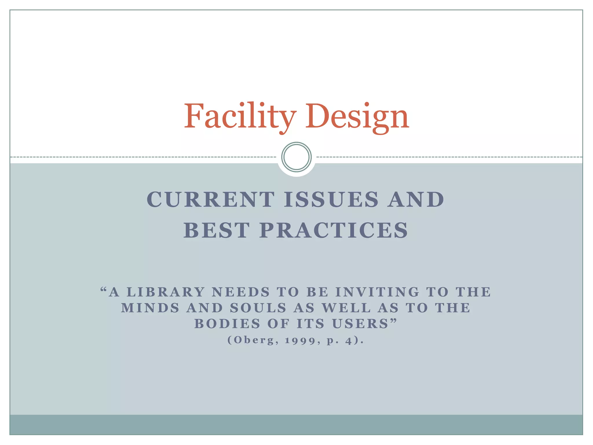 The document discusses current issues and best practices regarding facility design for school libraries. It describes trends toward more flexible learning spaces like café libraries and learning commons that aim to attract students. A café library introduces food and drink to draw students in but requires managing potential disadvantages. A learning commons transforms the library into an active collaboration space focused on functionality over books. Both models show increased student use but require managing concerns over commercial influence, noise levels, and access to print materials.
