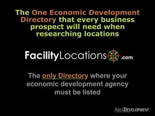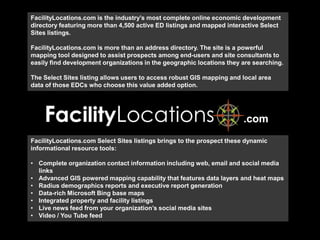 The document summarizes the features and benefits of FacilityLocations.com, an online economic development directory. It allows economic development agencies to create enhanced listings called "Select Sites" that provide prospects with mapping tools, property data, demographics reports and more to market locations. Prospects can search over 4,500 listings to find locations and connect with agencies. The directory aims to assist prospects in easily researching locations.
