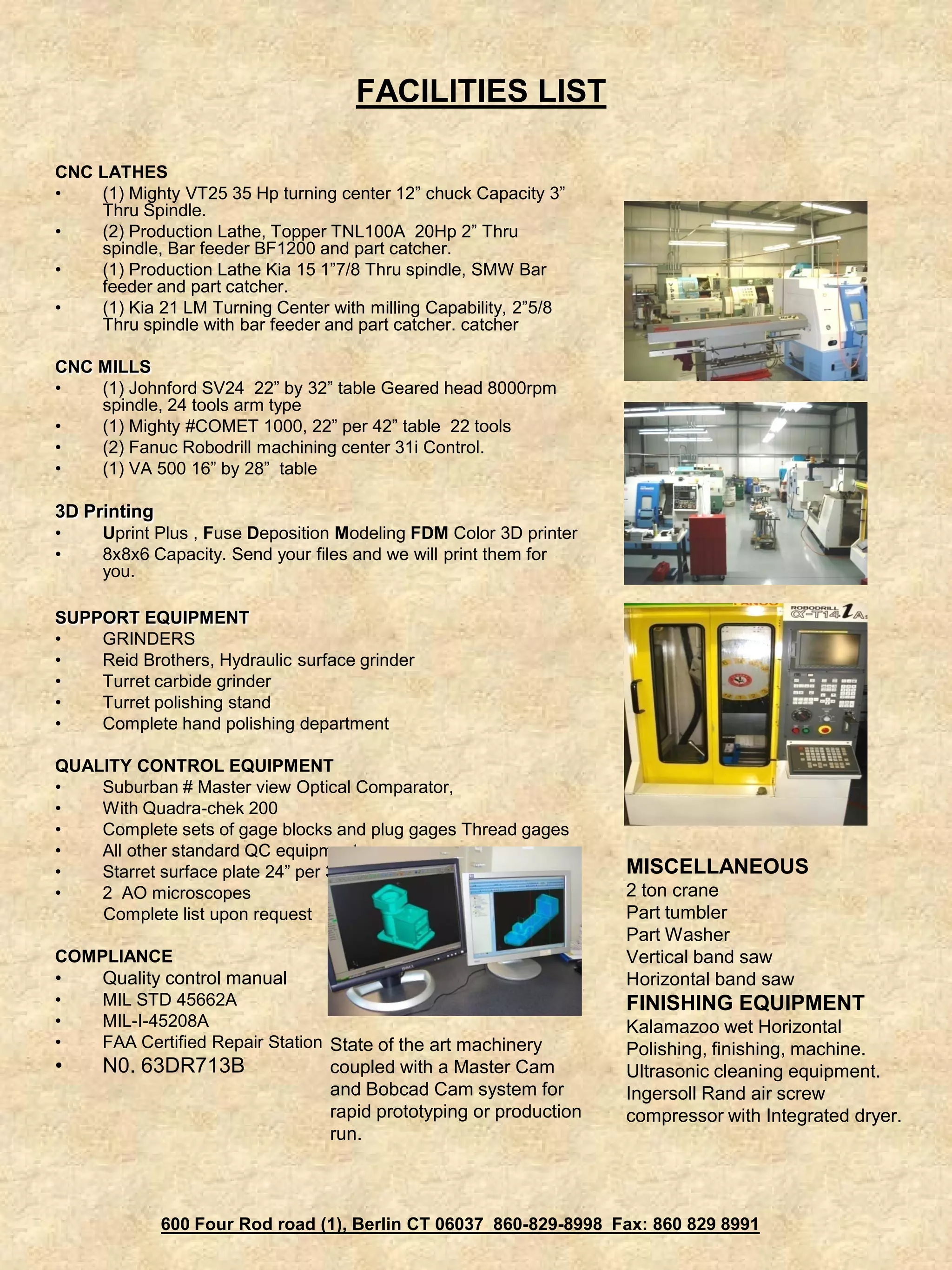 This document lists the facilities' equipment, including CNC lathes and mills, a 3D printer, support equipment like grinders and quality control tools, and miscellaneous items like band saws, a tumbler, and compressor. The facilities have state-of-the-art CNC machines from brands like Mighty, Topper, and Kia coupled with CAM software for rapid prototyping and production. Quality control equipment includes an optical comparator, gage blocks, and thread gages.