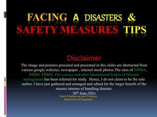 The document presents a comprehensive guide on disaster preparedness, covering various types of disasters such as earthquakes, floods, storms, and pandemics. It includes safety measures and tips for individuals to protect themselves during disasters, emphasizing the importance of awareness, readiness, and community support. The presentation aims to educate people on how to effectively respond to disasters and minimize potential harm.