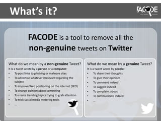 FACODE is a tool that analyzes tweets on Twitter and removes non-genuine tweets, providing a more accurate sentiment analysis for companies. It examines tweet content, user profiles, behavior over time, and compares tweets to identify patterns, spam, and inauthentic coordinated efforts. Case studies on brands like Bitcasa, iPhone and Apple products demonstrate how FACODE can significantly change sentiment polarity results and brand mention counts by filtering out fake or misleading tweets, providing companies with more reliable social media analytics.