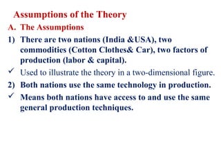 2) It outlines the key assumptions of the theory, including that countries have different endowments of factors and production of goods uses these factors with different intensities.