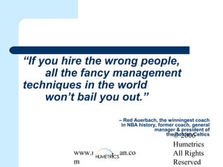 The document discusses developing a fact-based selection system for hiring employees. It notes that current systems often hire the wrong people. An effective system uses multiple sources of information about applicants, including application forms, interviews, testing, and background/reference checks. The goal is to recruit, select, and retain a high-quality workforce by gaining full transparency into candidates.