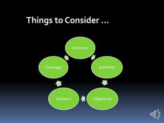 This document provides guidance on evaluating the accuracy, authority, objectivity, currency, and coverage of internet resources. It advises checking who authored the content, their credentials, the publisher, when it was created and last updated, and whether sources are cited. Domain names like .edu, .gov and .org typically indicate more authoritative sources. If a site lists a credible author, has been recently updated, and provides balanced and objective information with cited sources, then it may be a valuable resource.