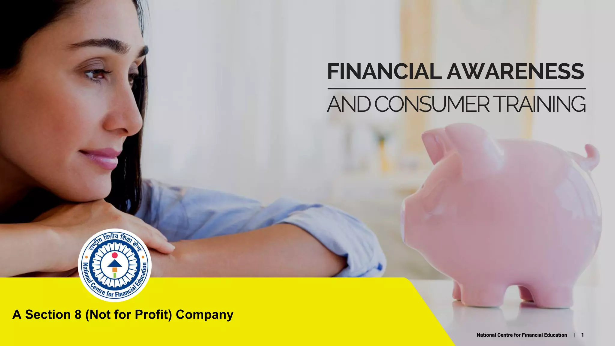 The document is about financial literacy and consumer training in India. It discusses the National Centre for Financial Education (NCFE), which was set up under government guidance to implement the National Strategy for Financial Education. The NCFE aims to make India financially aware and empowered by providing financial education campaigns. It also aims to help people access financial products and services through regulated entities with consumer protection. The NCFE finds that only about 20% of Indians are financially literate based on its survey, and many states are below this level. It discusses the importance of financial literacy and outlines some key topics to educate consumers.