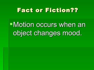 This document discusses various statements about motion and asks whether they are fact or fiction. It covers topics like the definition of motion, relative motion, uniform motion versus acceleration, positive acceleration, circular motion, rotation, scalar and vector quantities, average speed calculations, and acceleration calculations. The document poses multiple choice questions to test understanding of motion concepts.