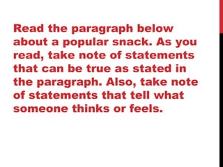 - To determine if a statement is a fact, ask if it can be proven. To determine if it's an opinion, ask if it expresses someone's thoughts/feelings.