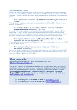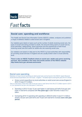 In 2012-13, local council spending on adult social care in England was £17.2 billion, which is a slight decrease from the previous year but shows a 52% increase over the past decade. The workforce in adult social services saw a decline to 140,700 jobs in 2013, with many councils reducing staff due to outsourcing and restructures. Additionally, real-term pay for care workers and social workers decreased by 2% from the previous year.