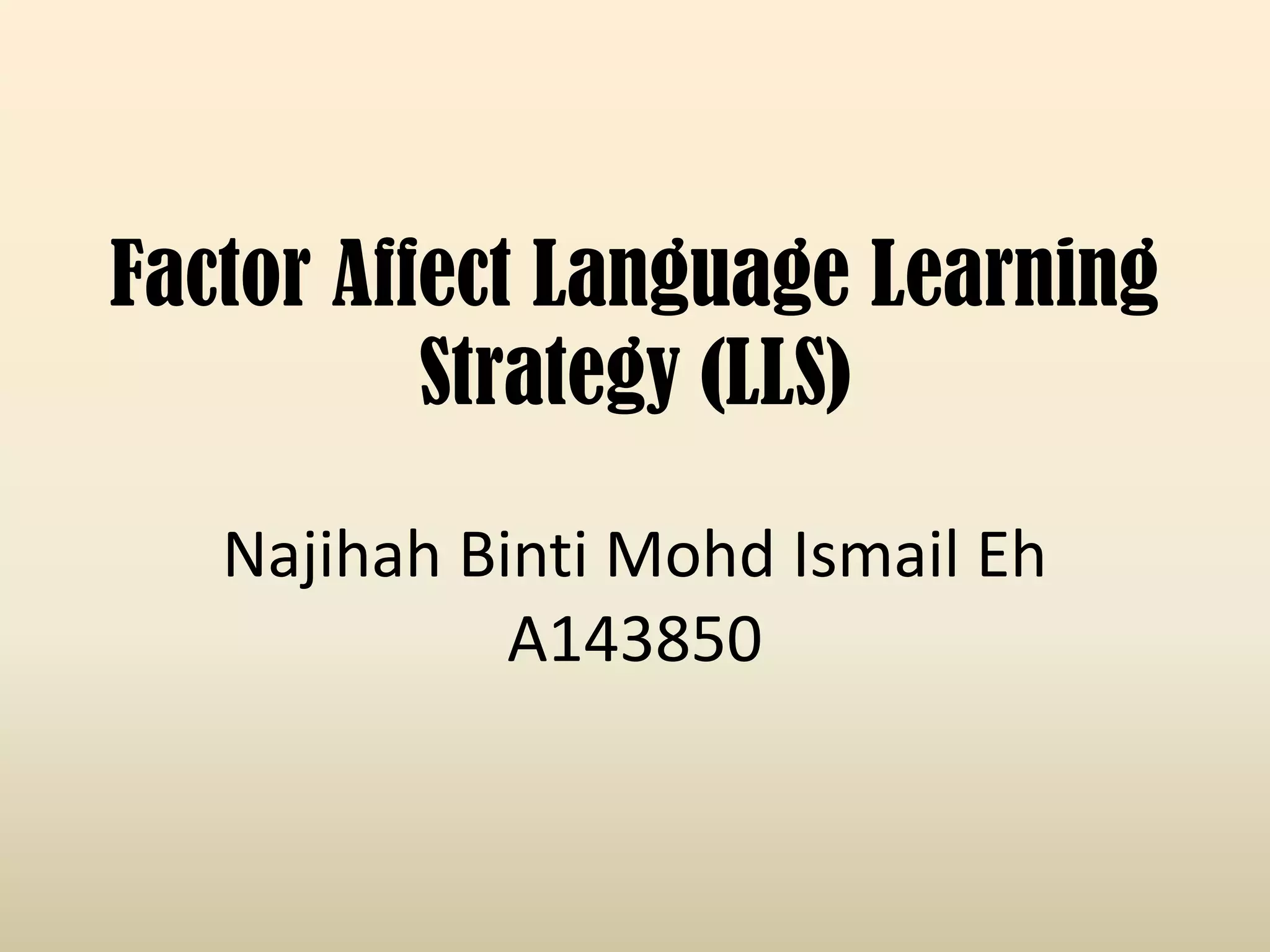 The document discusses five main factors that can affect language learning strategies: gender, age, level of proficiency, motivation, and experience studying a language. Regarding gender, several studies found that female students tend to use compensation and affective strategies more than males. Younger learners rely more on cognitive and social strategies, while older adults use metacognitive self-management strategies more. Beginner language learners employ fewer strategies than intermediate learners. Motivation is a primary driver of language learning, influencing how long and hard students pursue the language. Experience studying abroad positively impacts thinking and language learning abilities.