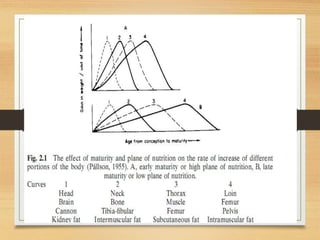 - Environmental conditions like temperature, humidity, and climate affect growth and development, with some breeds adapted to extreme hot or cold. Plane and quality of nutrition also differentially impact growth of tissues and organs.