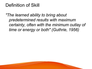 The document discusses factors that affect skill performance. It defines skill as a learned ability to produce predetermined results with minimum effort. Skills can be basic or complex and involve gross or fine motor movements. Performance is influenced by age, motivation, anxiety, facilities, coaching, and feedback. Skills are learned through demonstration, practice, trial and error, and role models. Feedback is important for improvement, as it provides information on technique (knowledge of performance) and outcomes (knowledge of results).