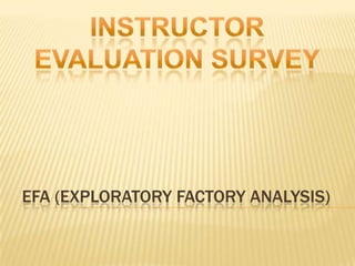 Factor analysis is a statistical method used to reduce the number of variables in a dataset by grouping correlated variables together into factors. It requires a minimum sample size of 10 observations per variable to avoid computational issues, and the Kaiser-Meyer-Olkin test and Bartlett's test are used to assess the factorability of the correlation matrix. The rotated factor matrix displays the factor loadings and shows which variables group together under each factor.
