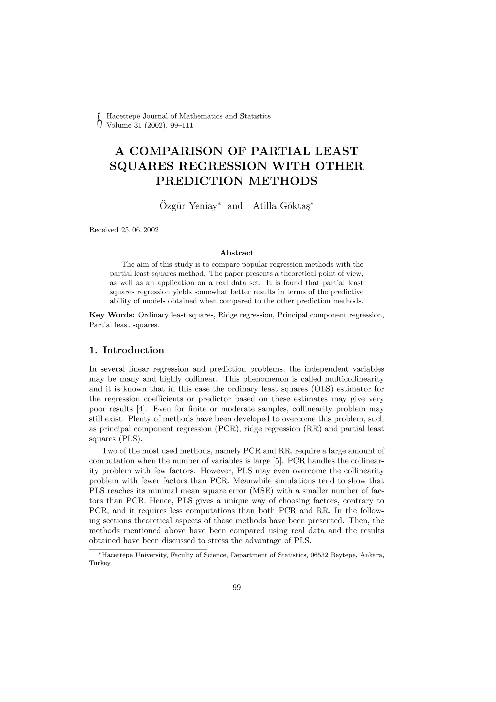 The document compares several regression methods, including ordinary least squares (OLS), principal component regression (PCR), ridge regression (RR), and partial least squares (PLS) regression. It finds that PLS regression generally yields better predictive models than the other methods when applied to real data with multicollinearity among predictor variables. The document provides theoretical background on each method and evaluates their performance on a real dataset using measures like root-mean-square error of cross-validation (RMSECV).