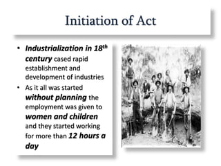 The document discusses key provisions of the Factories Act of 1948 in India. It was established to regulate working conditions and protect the welfare of factory workers. Some key points: