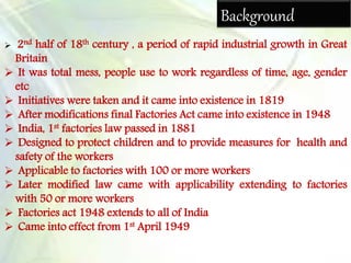 The Factories Act of 1948 aims to regulate labor in factories and ensure adequate safety and welfare of workers. It applies to factories with 10 or more workers and covers provisions around working hours, holidays, health, safety, welfare amenities and penalties. The act has been amended over time and now consists of 11 chapters covering topics such as hazardous processes, annual leave, definitions of who is considered a worker or child, and powers of inspection. Its overall goal is to protect vulnerable groups working in factories and provide a safe working environment for all.