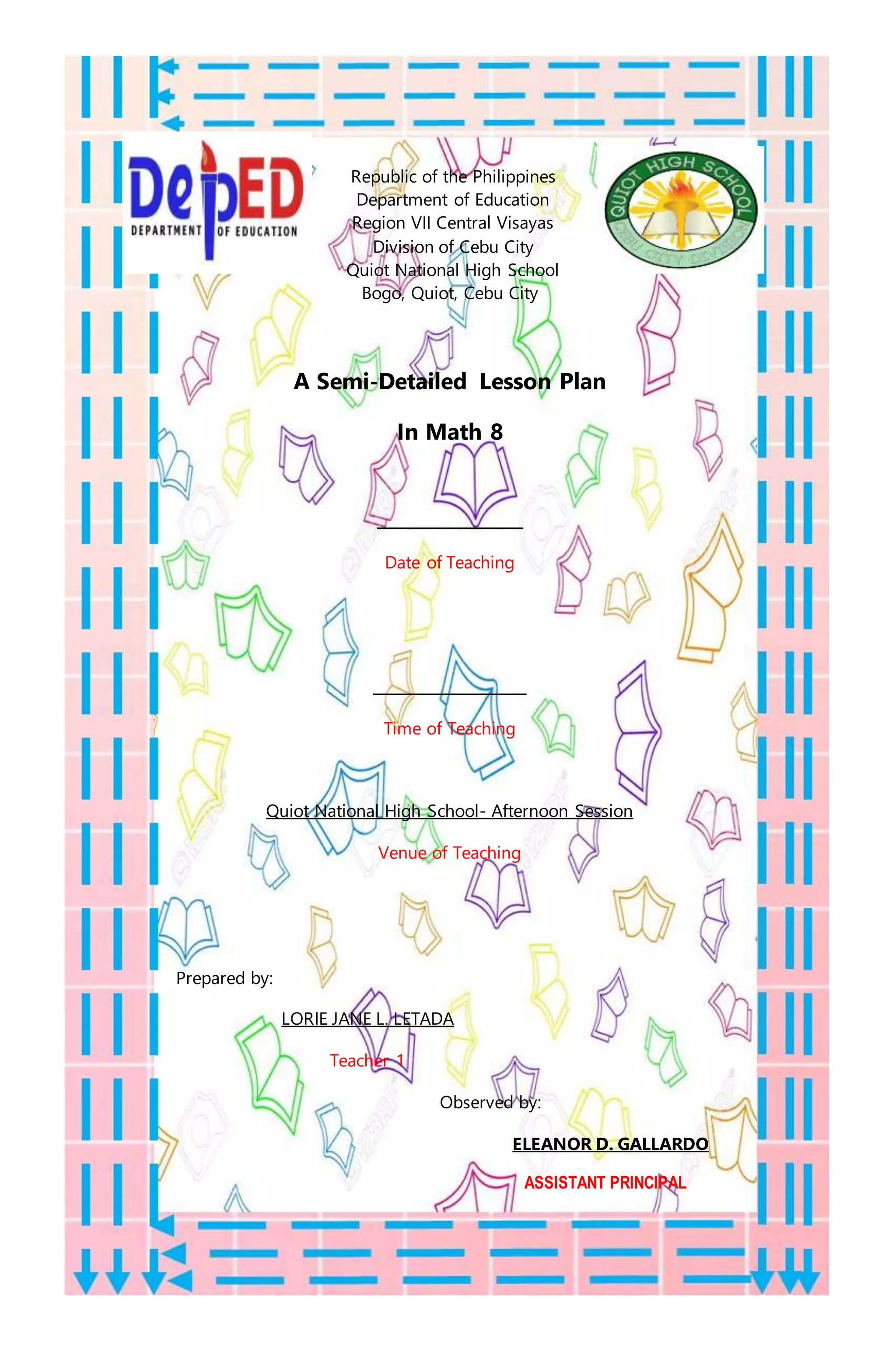 1. The document is a lesson plan for teaching factoring perfect square trinomials in Math 8. It includes intended learning outcomes, learning content on factoring perfect square trinomials, sample learning activities involving tiles, and examples to factor.