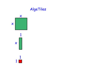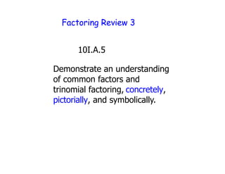 The document demonstrates factoring common binomials and trinomials through concrete, pictorial, and symbolic representations. Examples shown include factoring expressions such as x^2 + 5x + 4, x^2 + 6x + 8, -x^2 -x - 1, x^2 - 5x + 6, x^2 + x - 2, 2x^2 + 5x + 2, and 2x^2 + 7x - 4 by using concrete manipulatives, pictures, and symbolic notation to represent the factored forms.