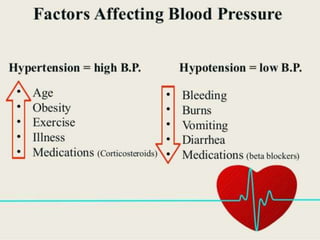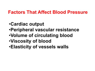 1. Cardiac output, peripheral vascular resistance, volume of circulating blood, viscosity of blood, and elasticity of vessel walls can increase or decrease blood pressure.