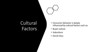 This document discusses the various factors that influence consumer behavior. It identifies cultural, social, personal, and psychological factors as key influencers. Cultural factors include buyer culture, subculture, and social class. Social factors are reference groups, family, and roles/status. Personal factors are lifestyle, economic situation, occupation, age, and personality. Psychological factors include perception, motivation, and beliefs/attitudes. Each of these factors shapes consumer selection, purchase, and consumption of goods and services.