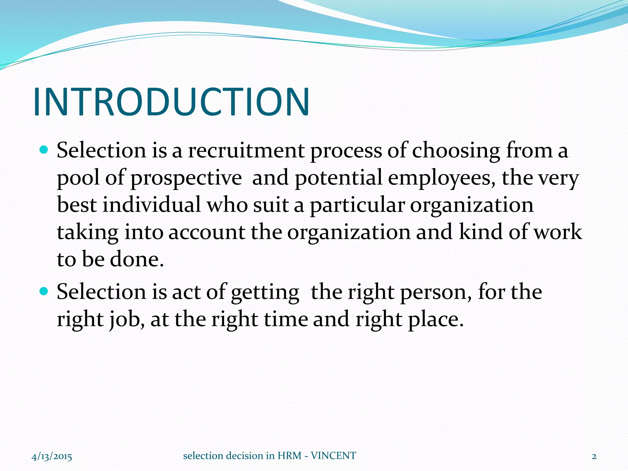 The document discusses the selection process in human resource management, emphasizing the importance of choosing the right individual for a specific role within an organization. It outlines various factors affecting selection decisions, including legal considerations, organizational type, applicant pool, and individual qualifications. The conclusion highlights that although selecting the right candidate is challenging, applying the discussed factors can mitigate uncertainties.