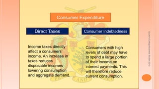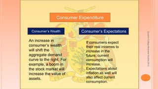 The document discusses factors influencing consumer spending and investment in the economy, including consumer wealth, expectations, taxes, and interest rates. It highlights how an increase in wealth can boost aggregate demand, while rising taxes and interest rates can reduce consumption and investment. Additionally, it addresses the effects of government expenditure and exchange rates on net exports and overall economic demand.