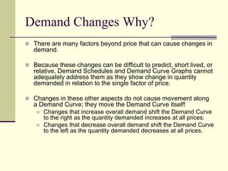 The document discusses factors that can affect demand beyond just price. These factors include consumer income, expectations, population change, and tastes/trends. Changes in these non-price factors do not cause movement along the demand curve, but instead shift the entire demand curve, either to the right if demand increases or to the left if demand decreases. Examples are given for how each factor can impact demand for certain goods.