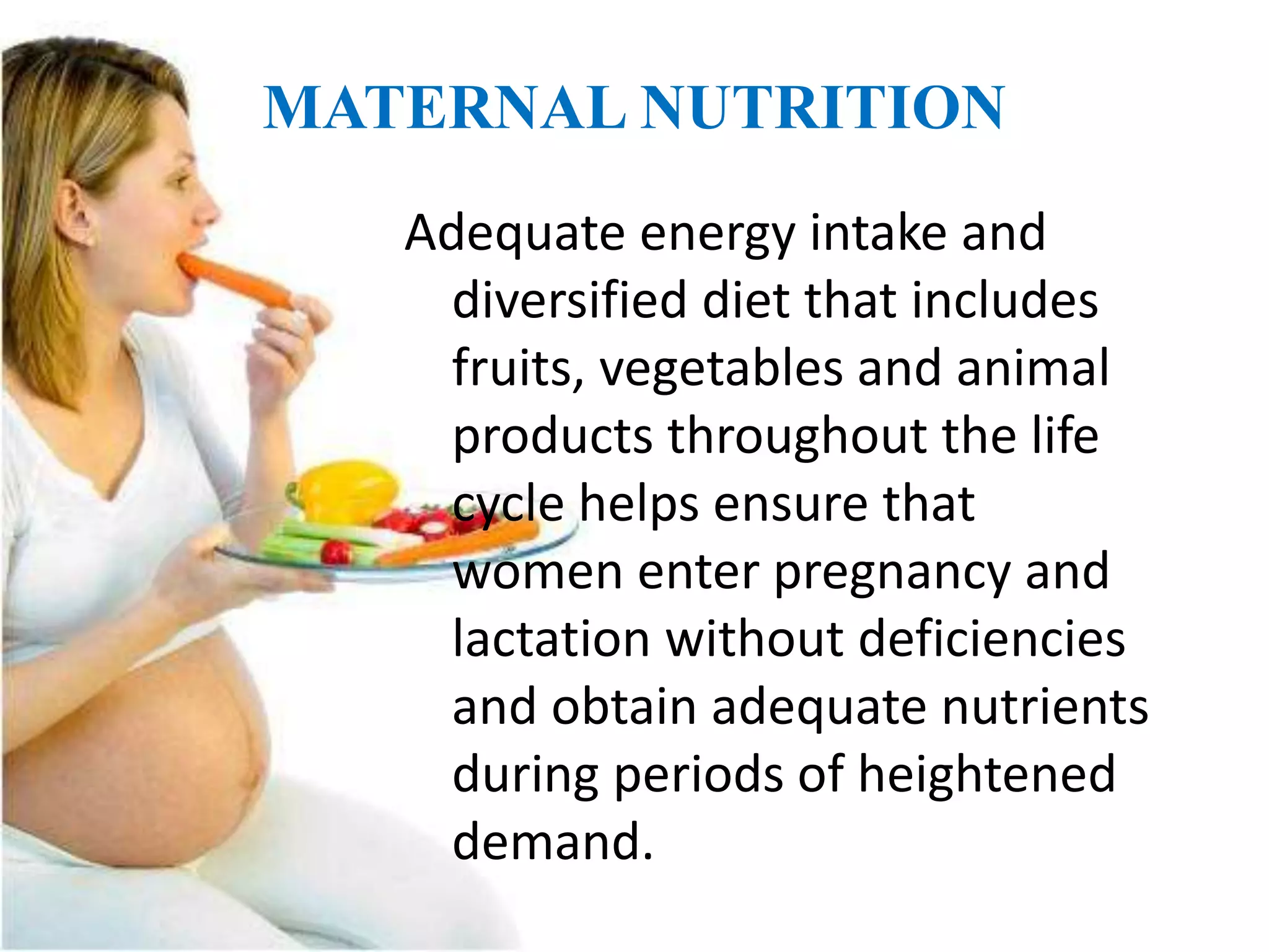 Maternal nutrition, child nutrition, early sensory stimulation, and adequate nutrient intake throughout the life cycle are key factors that affect child development. Maternal and child malnutrition can lead to developmental delays, poor health outcomes, and increased disease risk for both mother and child. Early sensory stimulation through the five senses is vital for brain development and learning in infants and children. A variety of factors like culture, stress, illness, and sensory deprivation or overload can impact sensory stimulation and development.