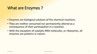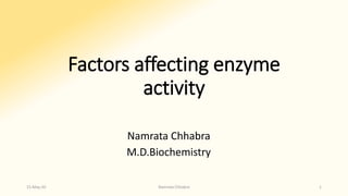 The document discusses factors that influence enzyme activity, notably substrate concentration, temperature, pH, and the presence of activators and inhibitors. It highlights concepts such as Michaelis constant (Km) and reaction kinetics, including first and zero order reactions. Additionally, it covers how enzyme concentrations and environmental conditions like temperature and pH optimize or inhibit enzymatic activity.
