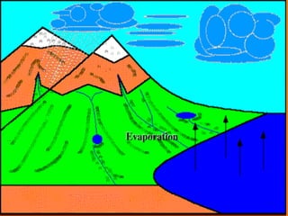 Evaporation is the process by which a liquid is converted into vapor below the boiling point. There are four main factors that affect the rate of evaporation: temperature, humidity, wind speed, and surface area. Higher temperatures, lower humidity, stronger winds, and larger surface areas of liquid all increase the rate at which evaporation occurs.