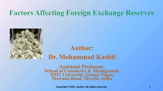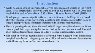 The document examines the factors influencing international reserves holdings of selected countries. It outlines the objective to examine these factors, describes the variables and methodology used. The methodology includes unit root tests, Johansen cointegration tests, and error correction models. The results show there is cointegration among the variables in the long-run. Specifically, there is a positive relationship between international reserves and economic growth, imports, and trade openness.