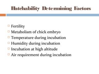 Hatchability is influenced by many factors including fertility, embryo metabolism, incubation temperature and humidity, oxygen requirements, egg handling and nutrition. Maintaining optimal temperatures of 99.5°F from days 1-19 and 89-99°F on days 20-21 is important as is humidity between 50-60%. Proper egg selection, storage, turning and nutrition can also impact hatchability. Genetics, diseases and other environmental stresses like high altitude can affect fertility and embryonic development.