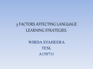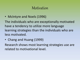 Five factors that affect language learning strategies are discussed: motivation, age, language proficiency, learning style, and cultural background. Highly motivated learners use more strategies than less motivated learners. Younger learners prefer task-specific strategies while older learners prefer generalized strategies. Lower proficiency learners adopt more strategies than higher proficiency learners. Learning styles also influence strategy use, with extroverts preferring social strategies and introverts preferring metacognitive strategies. Cultural background also impacts strategy use, with different cultural groups employing specific strategies at different frequencies.