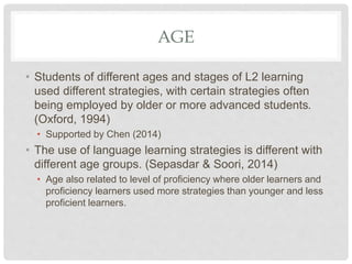 This document discusses several factors that affect language learning strategies, including age, gender, motivation, proficiency level, and socioeconomic status. Older, more proficient, and female learners tend to use more strategies and cognitive strategies more often. Motivation also influences strategy use, with more motivated learners using more strategies. Learners from higher socioeconomic backgrounds tend to perform better and use social strategies more frequently. The strategies used depend on factors like age, gender, proficiency level and motivation of the language learners.