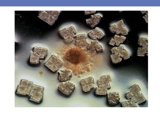 Sodium chloride affects microbial growth in different ways depending on the organism. Obligate halophiles require salt to survive and will lyse without it, while halotolerant organisms do not need salt but can tolerate some salinity. Halophiles are categorized based on their preferred salt concentrations: slight halophiles tolerate 1-6% salt, moderate 6-15%, and extreme 15-30%. Scientists control salt levels in culture media to selectively grow halophiles or inhibit non-halophilic microbes. Halophiles are found in briny and coastal environments and employ mechanisms like compatible solutes and potassium control to regulate osmotic pressure in high salinity conditions.