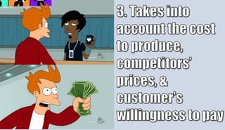 The document describes different types of market structures: perfect competition where many buyers and sellers transact standardized products at a single market price; monopoly where a single seller dominates the market and can set a profit-maximizing price; monopolistic competition where many firms offer similar but differentiated products giving them some monopolistic power; and oligopoly where a small number of large firms control the market and can influence prices. It also mentions factors like costs of production, customer demand in response to price, distribution costs, and existing market competition that influence business pricing and promotion decisions.