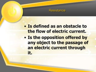 - Examples are given of how resistance changes with these factors in various applications like variable resistors. Formulas are provided relating resistance, length, area, resistivity, and temperature.