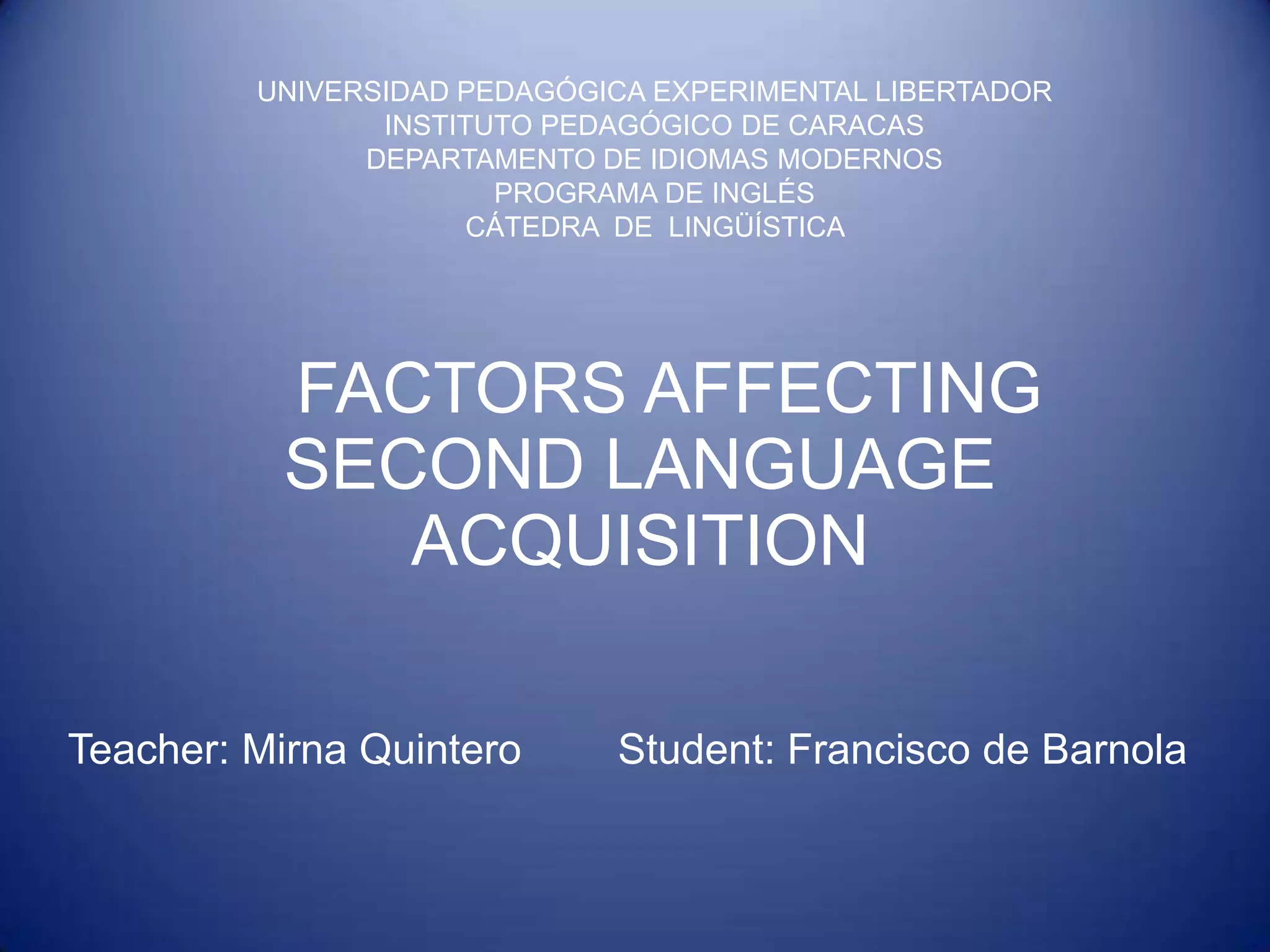 This document discusses factors that affect second language acquisition. It examines both individual factors like age, personality, motivation, experiences, and cognition, as well as affective factors including self-esteem, inhibition, risk-taking, anxiety, and empathy. For individual factors, it suggests that younger learners generally acquire a second language more efficiently, while motivated older learners can also be successful. Outgoing learners with more life experiences tend to progress faster than introverted learners or those without experiences. Higher motivation and cognitive ability also contribute to stronger second language acquisition. Regarding affective factors, low self-esteem, inhibition to take risks, and anxiety can negatively impact learning, while empathy and a willingness to take chances