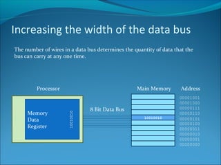 Increasing the width of the data bus allows more data to be transferred at once, speeding up processing. A 32-bit computer has a 32-line data bus and 32-bit word length. Cache memory holds frequently used data close to the CPU, allowing faster access via a wider bus and faster SRAM than main memory DRAM. Peripherals operate slower than the CPU, so increasing interface transfer rates like USB and Firewire versions improves performance. Some peripherals have their own processors and RAM to help speed performance.