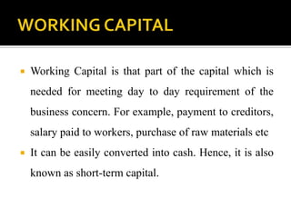 This document discusses factors that affect working capital requirements for businesses. It defines working capital and distinguishes between gross and net working capital. Some key factors that influence working capital needs include the nature of the business, size, production processes, seasonality, credit policies, and business growth rates. Manufacturing businesses tend to require more working capital due to longer production cycles. Faster inventory turnover and less generous credit terms also reduce working capital needs.