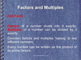 The document provides an overview of factors and multiples in mathematics. It defines factors as numbers that divide evenly into another number, and multiples as numbers that another number divides evenly into. It discusses finding common factors and common multiples between two numbers, as well as decomposing numbers into their prime factors. The document also covers calculating the highest common factor and lowest common multiple of two numbers using prime factor decomposition. Finally, it provides some practice problems for readers to work through.