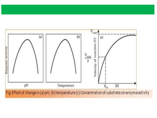 3) Enzyme activity is optimized at particular temperatures, pH levels, and substrate concentrations, and can be inhibited by chemicals that bind competitively to the active site and prevent substrate binding.
