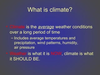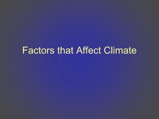 This document discusses various factors that affect climate, including latitude, altitude, distance to large bodies of water, ocean currents, prevailing winds, and topography. It provides examples of how each factor influences climate and temperature patterns. For instance, coastal areas tend to have more moderate temperatures due to the ocean's moderating effect, while inland locations experience more temperature fluctuations. Higher altitudes also generally have cooler temperatures. The document emphasizes that climate considers long-term weather trends over many years, as opposed to short-term weather conditions.