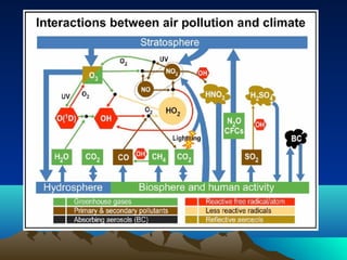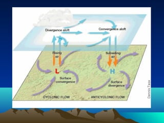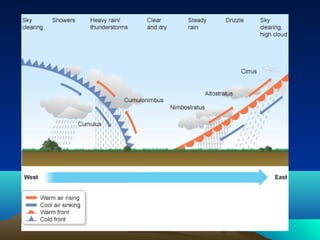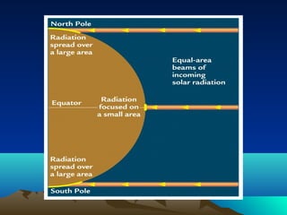 There are many factors that influence a region's climate, including latitude, altitude, proximity to water bodies, air pressure systems, solar radiation, ocean currents, and the amount of urban development. Latitude determines a location's position north or south, affecting sunlight exposure and temperature. Altitude and topography also impact temperature, with colder conditions at higher elevations. Bodies of water and differences between land and sea areas further modify local climates.