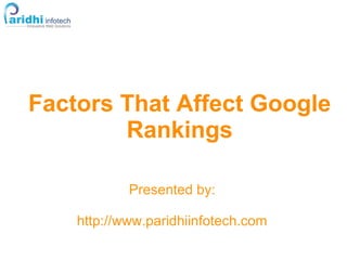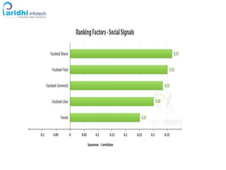 This document discusses factors that affect Google rankings, including on-site factors like domain authority, name/address/phone consistency, and reviews; off-site factors like number and quality of citations and inbound links; and social factors like tweets and mentions. It provides tips for optimizing a Google Places page and website to improve local search rankings through elements like business categories, photos, descriptions, and structured data. Experiments show that campaigns to increase tweets, likes, and shares about a page can quickly boost its search ranking.