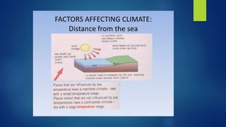 Latitude, altitude, distance from the sea, relief of the land, and proximity to large bodies of water all influence a region's climate, with latitude affecting temperature, altitude making high places cooler, and proximity to the ocean moderating temperatures. Climate further impacts the types of plants and animals that can survive in different areas, like the diversity of species found in tropical rainforests near the equator.