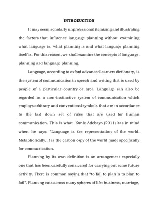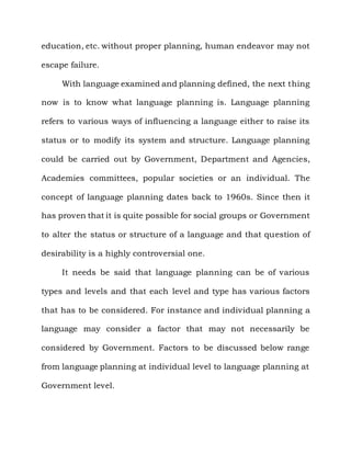 This document discusses factors that influence language planning. It defines language as a system of communication using symbols according to rules. Planning is defined as arrangements made in advance, especially carefully. Language planning refers to ways of influencing a language's status or structure. Some key factors that influence language planning include linguistic factors like a language's characters/status; political factors like a government's role and goals; and socio-demographic factors like a language's number of speakers and their geographical distribution. Attitudes towards languages also influence language planning. A language plan requires consideration of these various influencing factors.