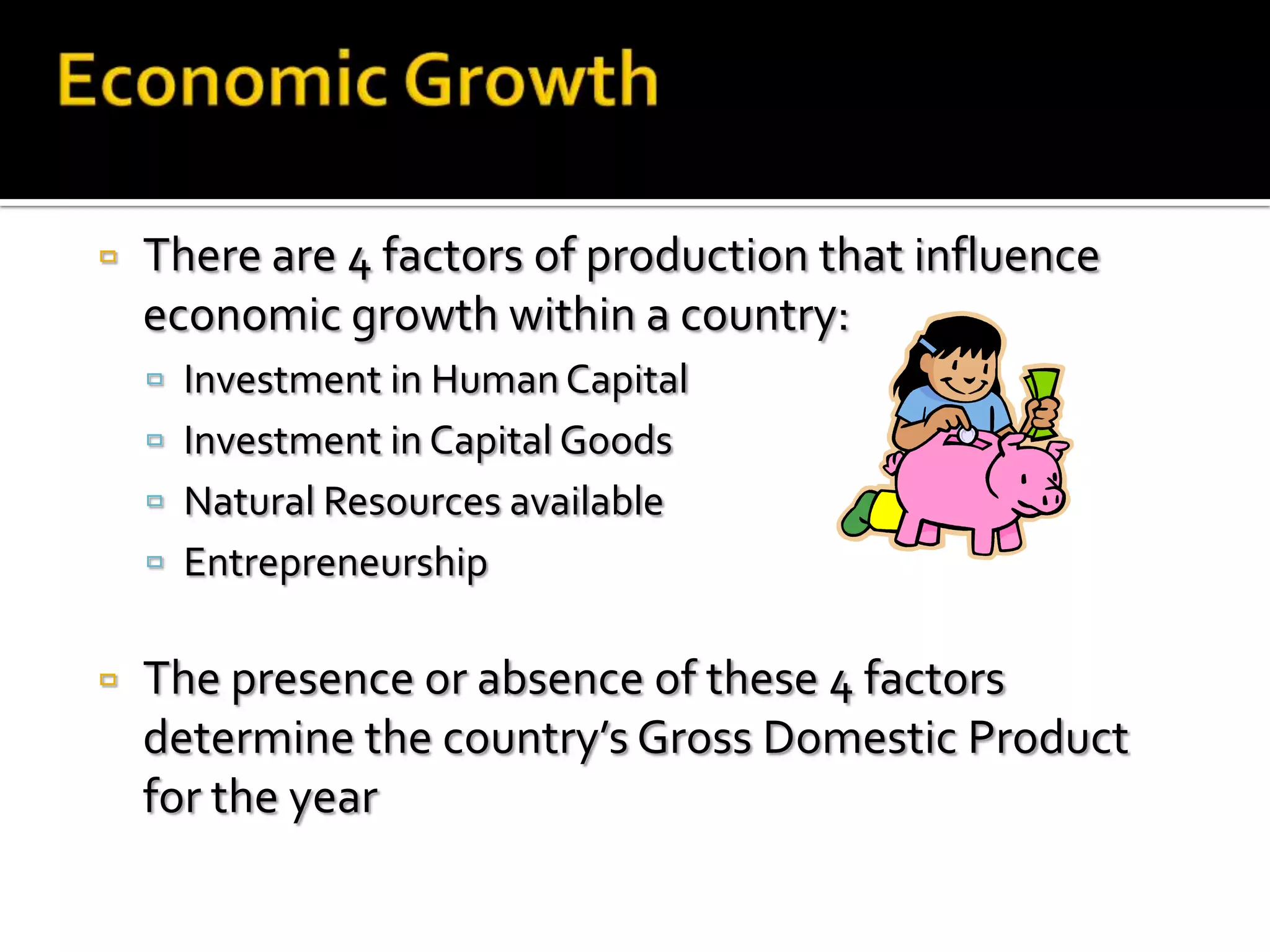 This document discusses the four factors of production that influence economic growth: investment in human capital, investment in capital goods, natural resources, and entrepreneurship. It explains that the presence or absence of these four factors determine a country's gross domestic product. Nations that invest in education and training will have a more productive workforce that can boost technological advances and GDP. Economic growth is measured by increases in GDP over time and is influenced by a country's resources and investments in physical and human capital.