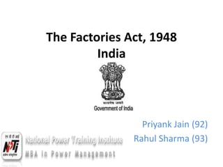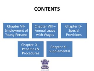 The document summarizes key provisions around the employment of young persons from India's Factories Act of 1948. It discusses prohibitions on employing children under 14 (Section 67), requirements for certificates of fitness for adolescents 14-18 (Section 68, 69), limits on work hours and shifts for children (Section 71), and record keeping requirements related to young workers (Sections 73, 74). It also gives the labor inspector powers to require medical exams if they suspect a young person is unfit for work (Section 75).